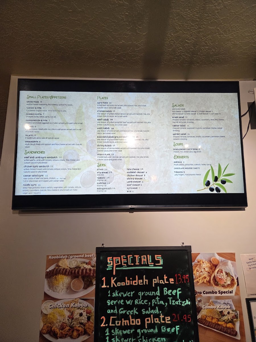 From a reviewer’s perspective, the menu at Black Olive Mediterranean Cuisine offers a well-rounded and satisfying snapshot of Mediterranean comfort food, bringing together familiar classics and crowd-pleasing favorites. To start, the salad selection-Garden Salad, Caesar Salad, and Greek Salad-provides light, refreshing options that balance freshness with traditional flavors. The appetizer section sets the tone nicely with staples like Dolmas, Spanakopita, Tzatziki & Pita, Falafel, and Babaganoush & Pita, all of which highlight the restaurant’s focus on shared plates and authentic Mediterranean starters. For heartier choices, the plates stand out, especially Combo Kabob, Beef Kabob, Lamb Kabob Veggie Plate, and Shrimp Kabob, each offering a satisfying main course that showcases grilled meats and vegetables. The sandwich lineup, including Chicken Gyro Sandwich, Caesar Salad Gyro, Beef And Lamb Gyro Sandwich, and Falafel Gyro, is ideal for guests looking for bold flavors in a more casual, handheld form. Complementing these are classic sides such as Babaganoush, Gyro Meat, Hummus Fries Sauce, and Feta Cheese, which allow diners to customize their meals. The comforting Avgolemono Bowl and Avgolemono Cup add a warm, traditional touch to the soup offerings, while the dessert menu-Tiramisu, Baklava, and Chocolate Mousse Cake-provides a sweet and satisfying conclusion. To round things out, a simple but practical drink selection including Snapple, Bottle Of Water, Bottle Of Soda, and Can Of Soda ensures something for everyone. Overall, the menu feels thoughtfully curated, making Black Olive Mediterranean Cuisine a reliable destination for anyone craving classic Mediterranean dishes presented in a familiar, approachable way.